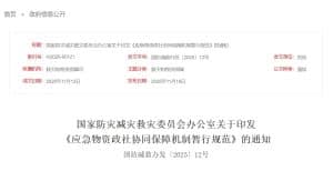 Article 2 The emergency materials government-social cooperation guarantee mechanism (hereinafter referred to as the “government-social cooperation mechanism”) is established under the leadership of the Office of the National Disaster Prevention, Reduction and Relief Commission (hereinafter referred to as the “National Disaster Prevention and Relief Office”) and the Ministry of Emergency Management. It engages social organizations including foundations, industry associations, social service institutions, and volunteer service organizations as member entities. Based on the government-led allocation of emergency rescue materials for major emergent incidents such as natural disasters, this mechanism serves to standardize social assistance and donated materials. As required, the National Disaster Prevention and Relief Office and the Ministry of Emergency Management shall coordinate with the Ministry of Industry and Information Technology, the Ministry of Transport, the Ministry of Commerce, the National Food and Strategic Reserves Administration, the Red Cross Society of China, and relevant provincial-level departments to provide guidance and support for the mechanism’s operation.